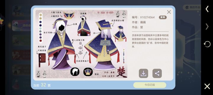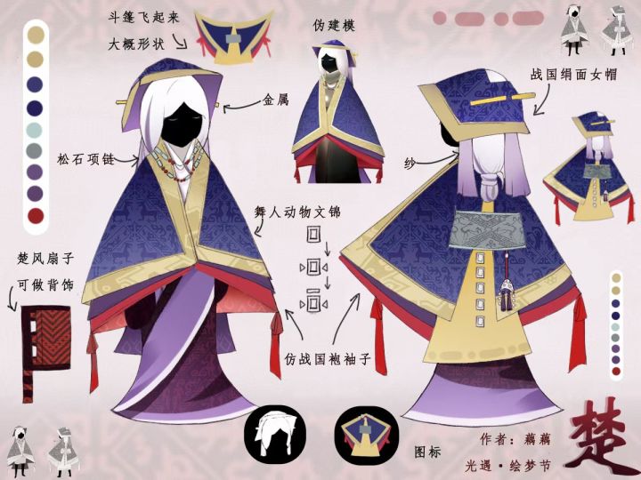 战国袍下摆如同鱼尾般先收紧后放开,于是我在斗篷的背面加入一块如同梯形的布料去体现这样的特点