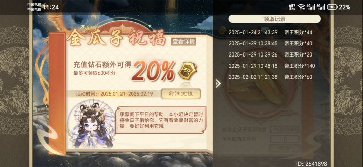 中午以为卡了,刚上线看还是没到账,难道是因为我冲完直接换成积分了,系统没反应过来吗?