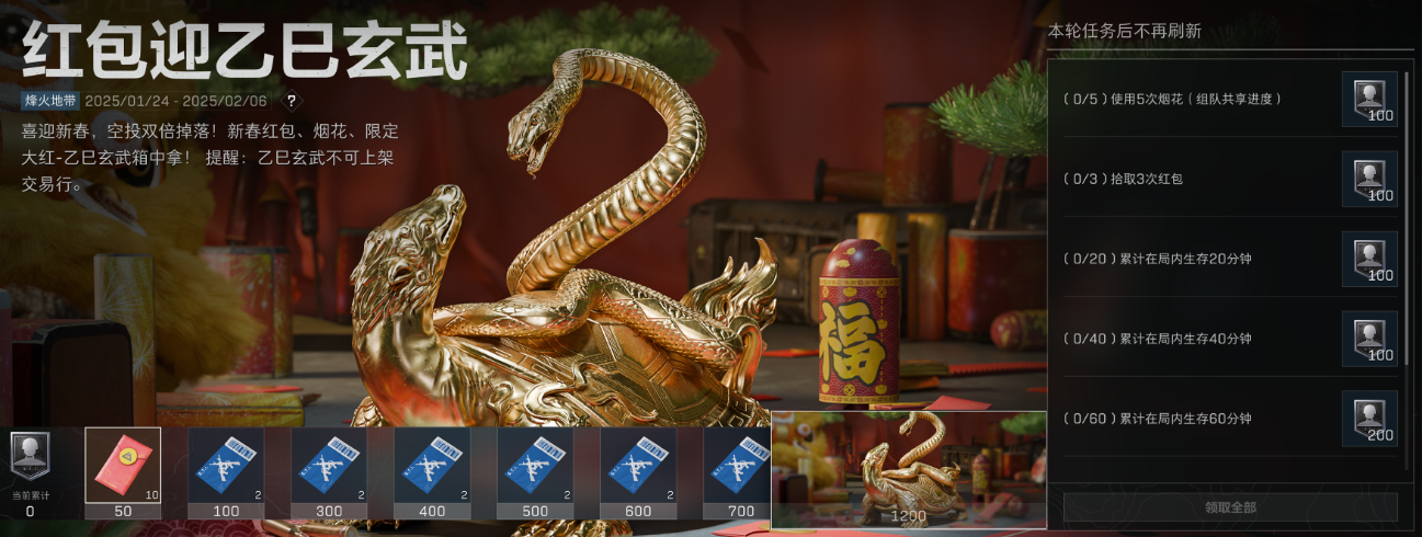 在摸金时捡3个红包,使用5次烟花,累计存活120分钟就能完成本轮全部任务