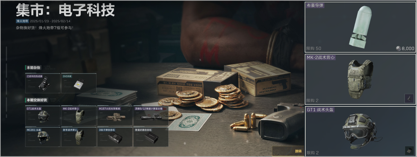 摸金活动总结:本期集市所需道具是已损坏的热成像和DVD光驱,新春集换卡是搜集红包,蛟龙活动需要5个蛟龙机密档案和5个声纳定位器。玄武活动需用掉5个烟花(可在集市-电子科技活动页面直接购买带进去,也可以在地图内搜集),推荐地图零号大坝!推荐角色骇爪(找东西很安全)在摸金时记得收集这些,撤离2次,存活累计120分钟,在没人的地方或撤离的时候放一下烟花,最后在去红鼠,那这一期的活动奖励就全拿下啦,接下来是活动汇总啦!