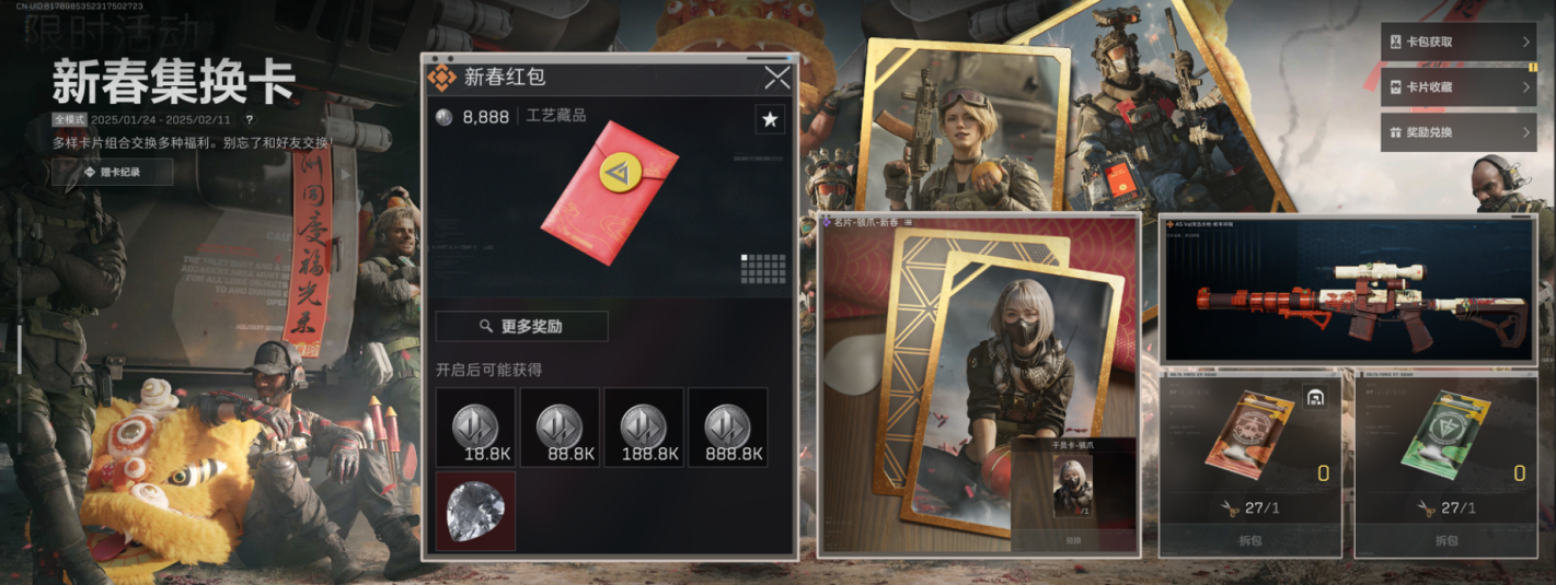 奖励:共有1个皮肤AS Val突击步枪-蛇年祥瑞,32个物流凭证,1个挂饰-春结,还有4个新春红包,5个3级子弹自选包,15个全面战场经验倍增卡,15个武器高级经验卡,另还有各干员的新春专属名片!