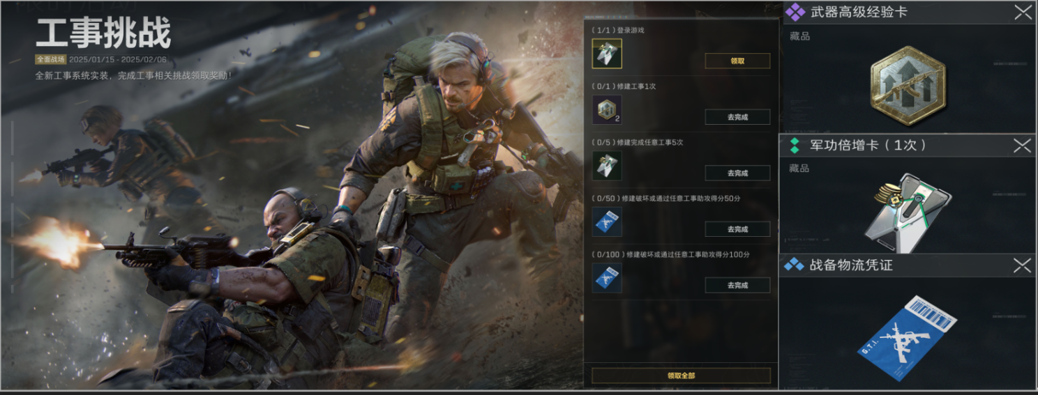 奖励:共计2个军功倍增卡,2个武器高级经验币,还有2个物流凭证。