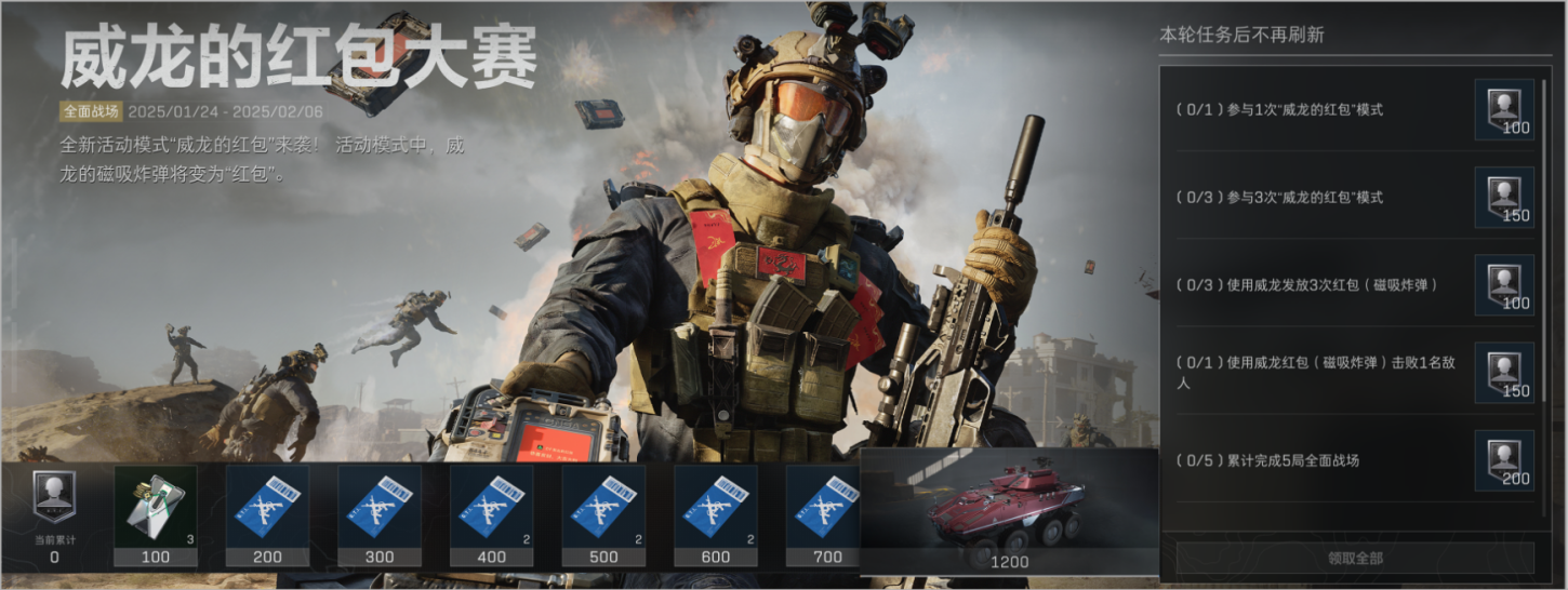 累计参与3次威龙的红包模式,使用威龙红包(磁吸炸弹)击败1名敌人,发红包3次就可以完成全部任务
