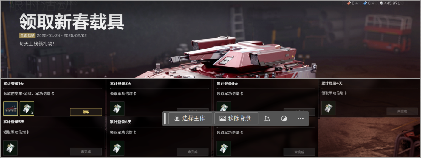 奖励:共有1个车辆涂装防空车-酒红和9个军工倍增卡