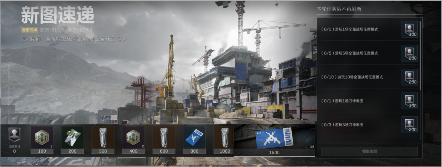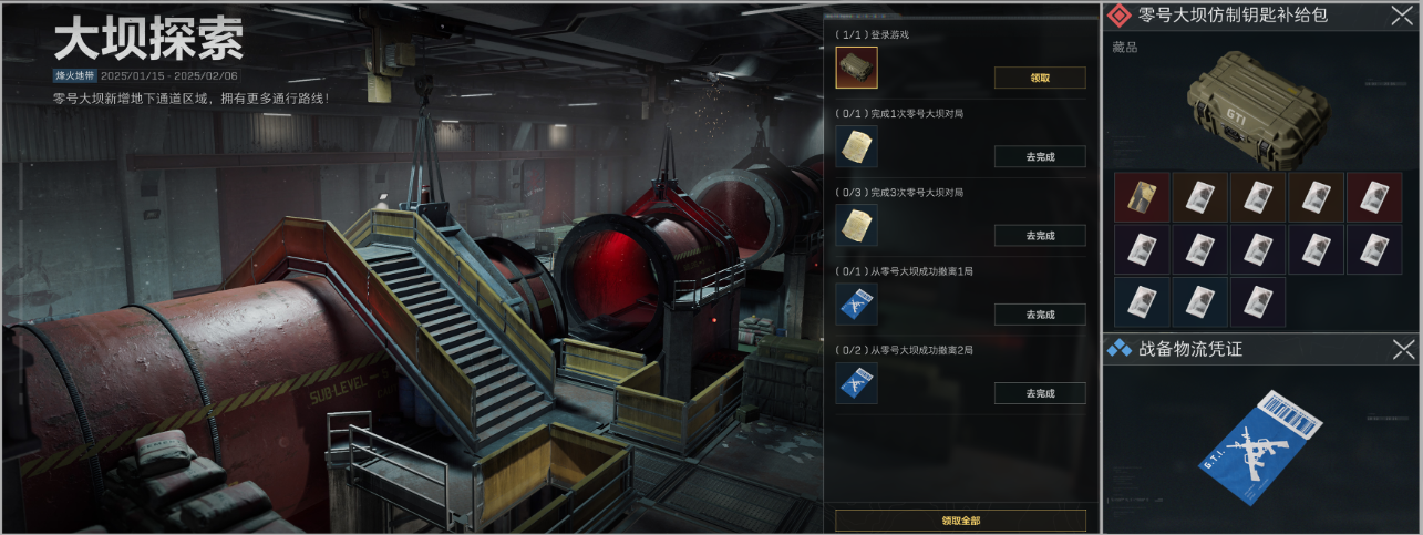 登录就能领1个钥匙包,在零号大坝对局3次,撤离2次就能完成全部任务