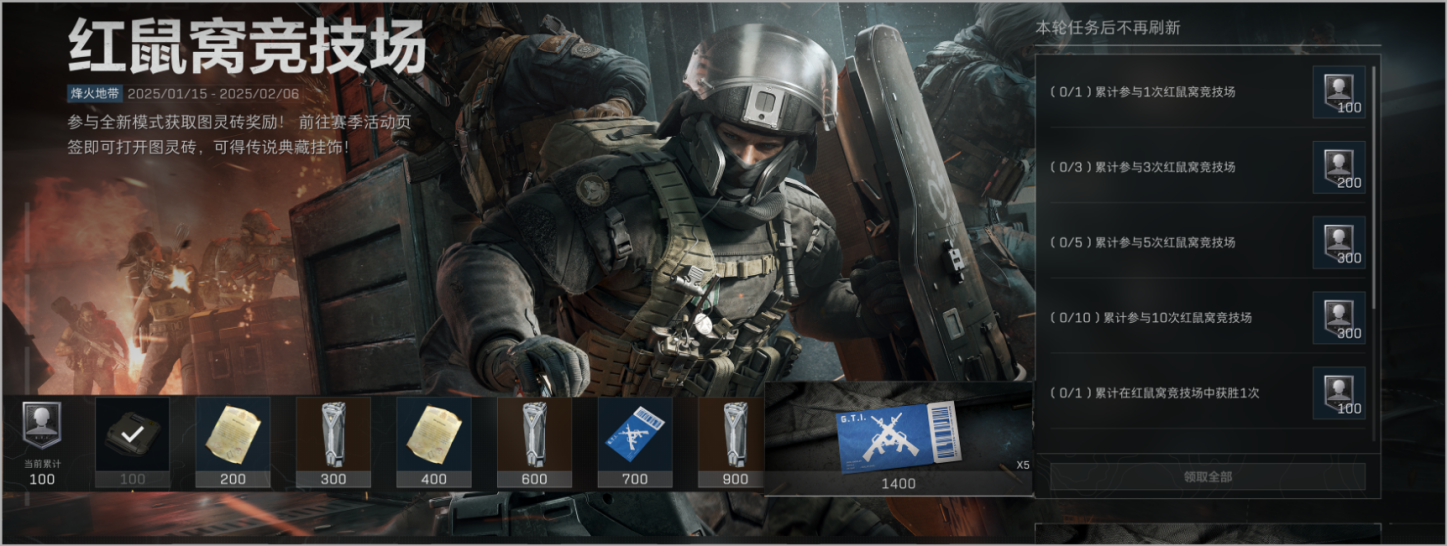 累计参与10次红鼠竞技场,胜利1次就能完成本轮全部任务。