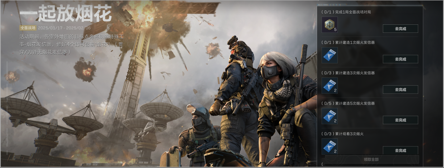 全面战场模式,只需要在断轨模式里修建很容易就完成了,烟花任务也很简单,是一个类似小卫星一样的东西,如果找不到就按6,调出建造模式后就会看到透明的小锤子,就可以建造啦,在建造好A与B后看天上就行了,另外在分别去玩一下威龙模式和5次刀锋模式,就轻松拿下全部奖励啦,新图也很好玩哈哈!