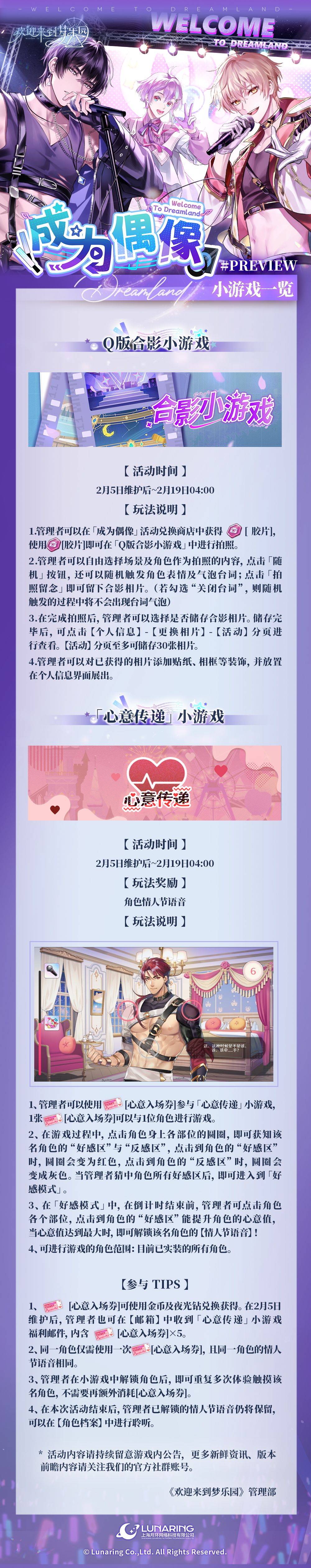 「成为偶像」活动将于2月5日维护后开启,点击下方长图,即可查看活动&小游戏详情一览↓↓↓