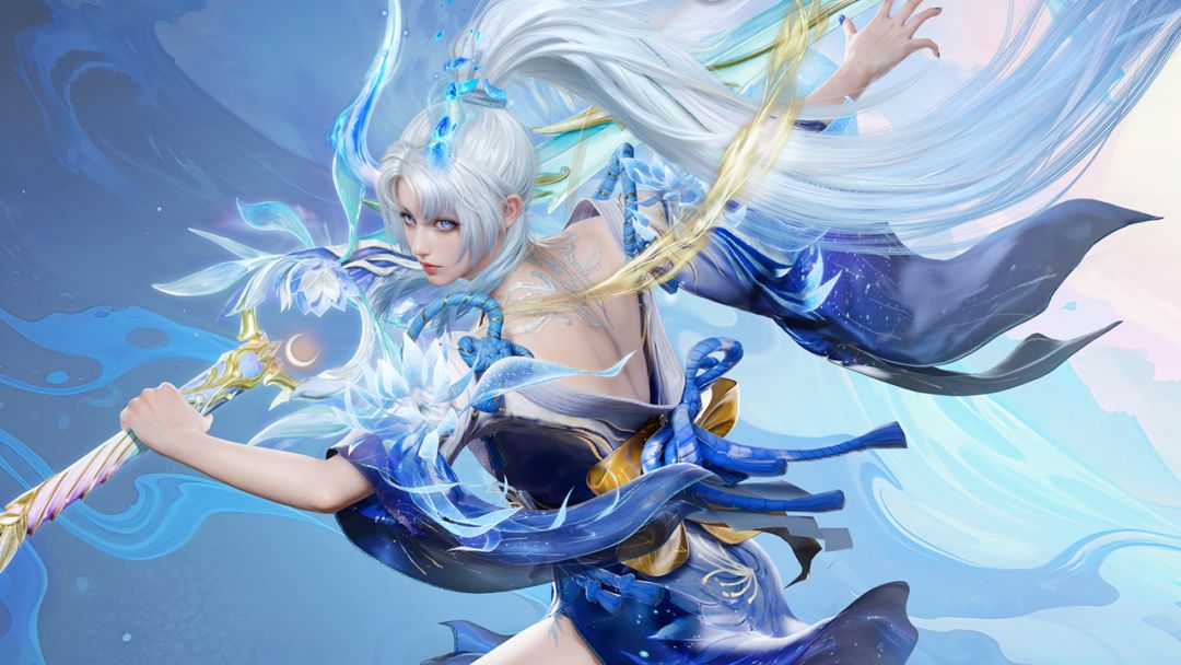 在袖口处有精美的昙花装饰。颈背处光纹忽隐忽现,身后的蓝月不断轮回。