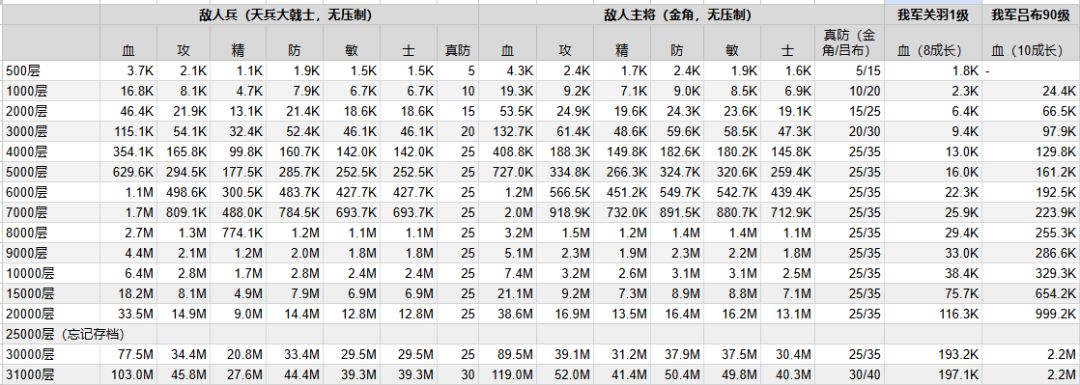 下表记录了各层敌军的属性。并附有我军没培养的关羽(1级)和吕布(90级)血量变化作为参考。