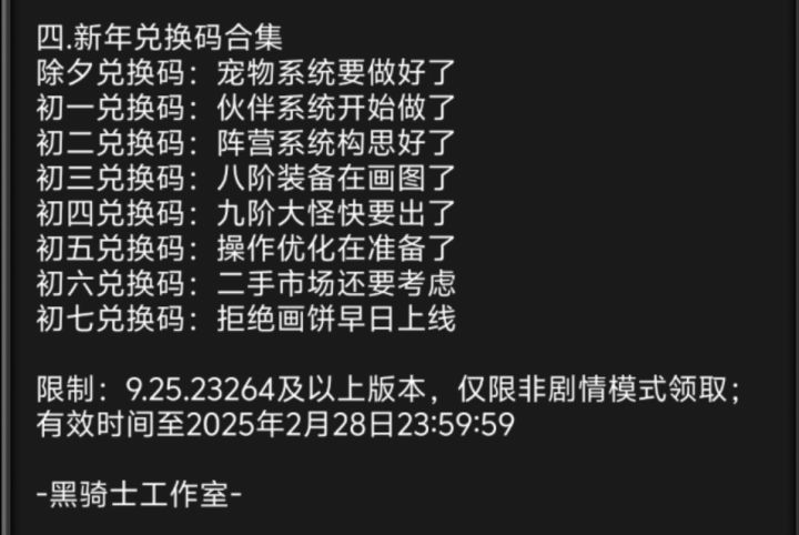 除夕兑换码:宠物系统要做好了初一兑换码:伙伴系统开始做了初二兑换码:阵营系统构思好了初三兑换码:八阶装备在画图了初四兑换码:九阶大怪快要出了初五兑换码:操作优化在准备了初六兑换码:二手市场还要考虑初七兑换码:拒绝画饼早日上线