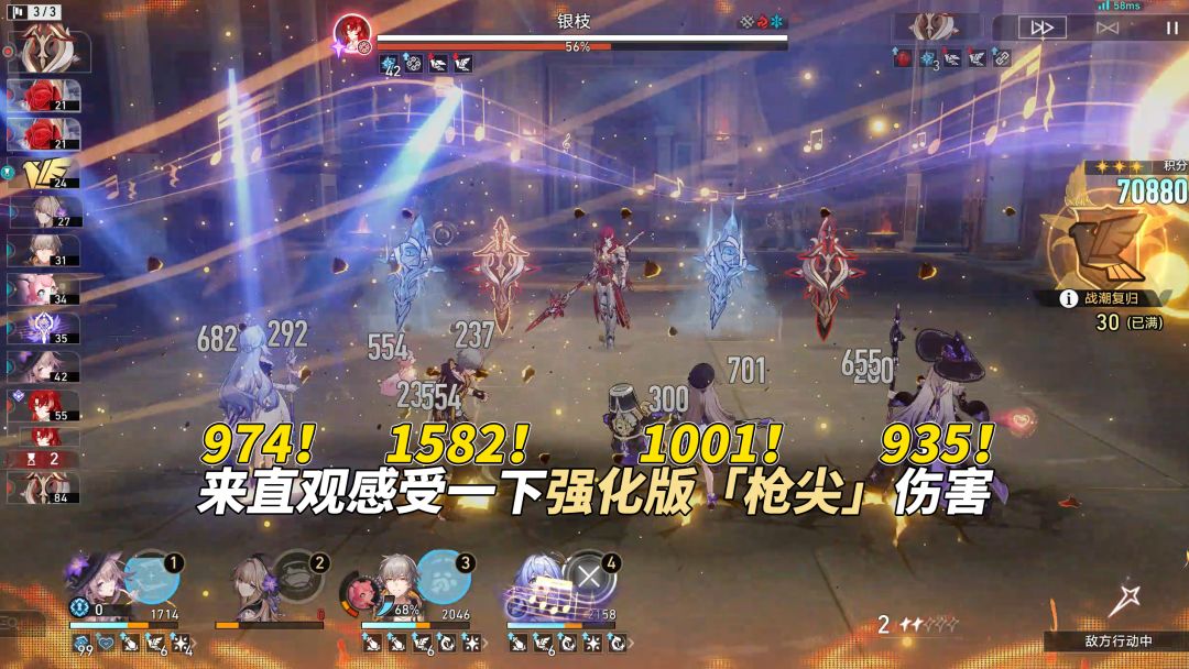 战斗中银枝会强化某个雕塑,若其强化目标为「枪尖」,可考虑优先消灭,避免被其高额群体伤害削减过多血量,导致后续BOSS再动时减员。