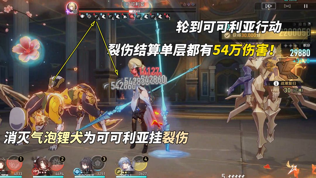尽可能多的消灭第3波气泡锂犬!当它被消灭时会自爆,使周围敌方单位陷入裂伤状态。一旦可可利亚被挂上裂伤,行动结算时每层裂伤可造成54.2万伤害,动辄就是百万贡献,非常美妙~
