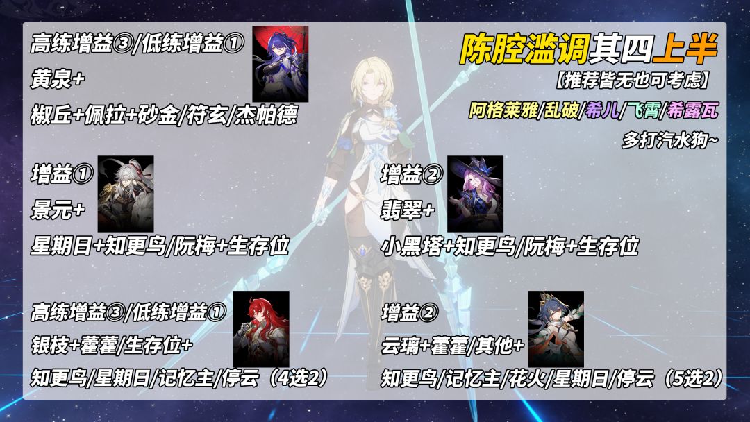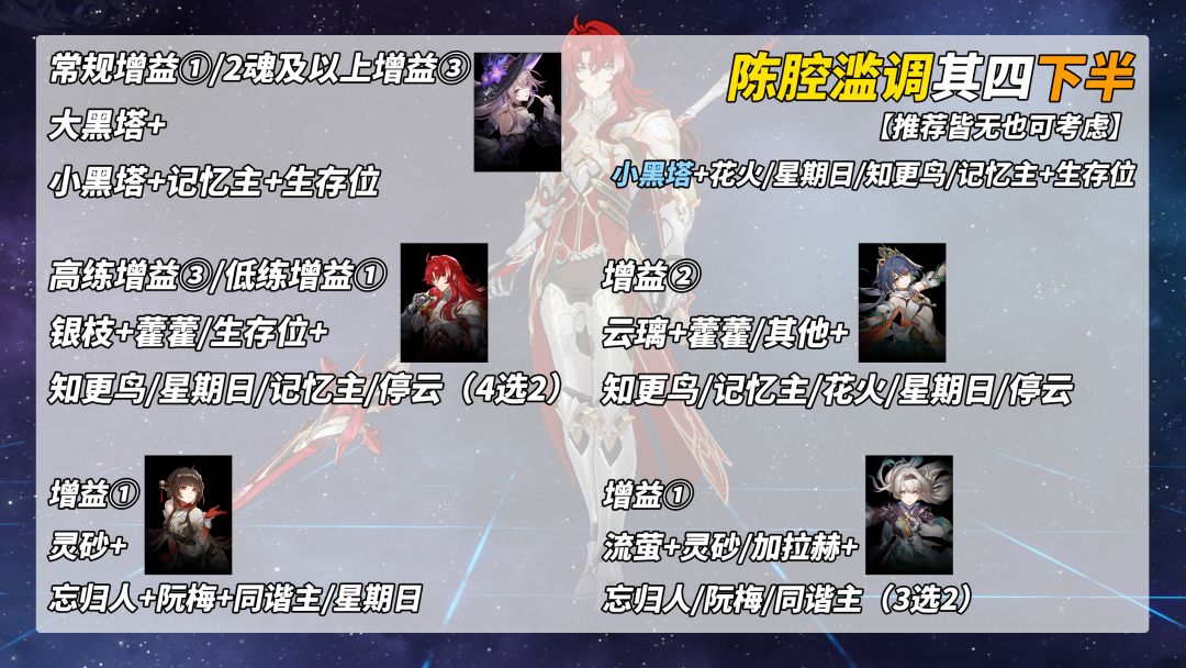 【混分推荐】增益①,小黑塔+花火/星期日/知更鸟/记忆主(4选2)+生存位。搭配5星辅助,能轻松达成2万+,其余则靠上半场努力了~
