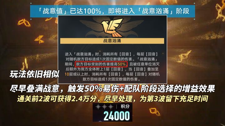 ※消灭1个敌方单位,我方获得1层【回音】。进入「战意汹涌」时消除层数结算伤害,每层2万伤害、攻击随机单位,后续每满10层都会立即结算1次伤害。