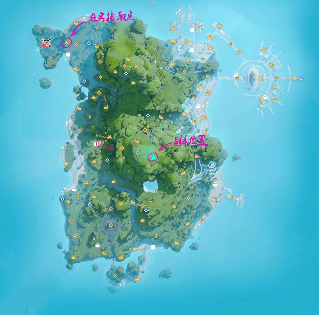前往探险岛需要先在伙伴岛西北BOSS附近与NPC对话接取任务,任务接取位置如图所示。随后前往岛的中心位置出现的副本,完成副本后再次回到任务接取点与NPC对话,即可前往探险岛。
