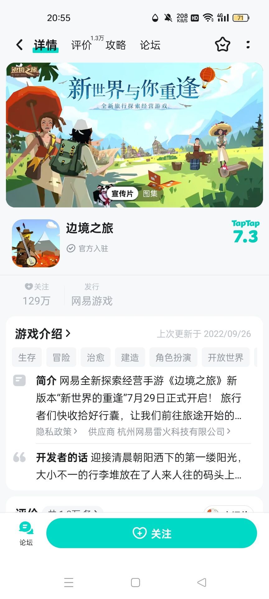 但是写此文的首要目的并不是怀恋往昔,而是详述现状,往好的方面想,目前的情况已经是所有的可能中最好的一种了,taptap上关于游戏的下架,我昨日去了解了一下,只是没想到昨日刚了解清楚,今日就碰巧用上了,下架的游戏似乎有两种情况,一种是玩不了游戏,游戏仅变为关注状态,但还能被搜到,评分和评价保留,比如边境之旅,如图1;