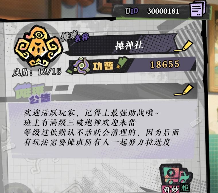 另外傩班收人,一定要活跃玩家,等级太低会清理,因为现在看不到你离线时间,只能用这种有点狗的办法了,后面有活动是全傩班一起参加,活跃玩家太少进度会非常缓慢,上测就吃了大亏。