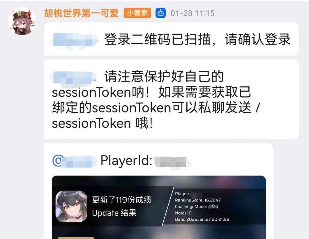 因为某种原因导致胡桃bot没法自动更新存档信息,所以每次查分时要先@胡桃并/update(这个指令在弹出的指令列表里有,可以直接点不用输入的),显示更新后再@胡桃并/pgr(这个指令列表里也有)