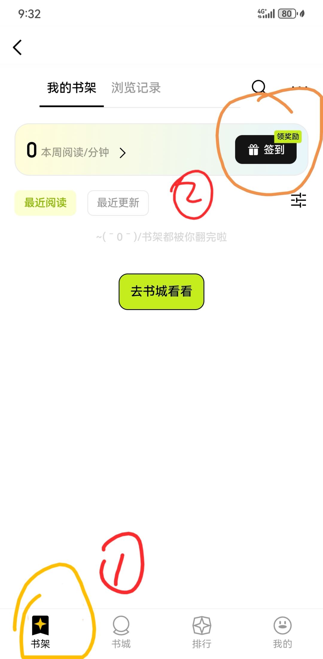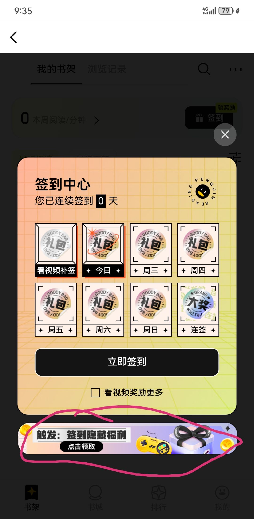 2、点击底部书架,再点击签到