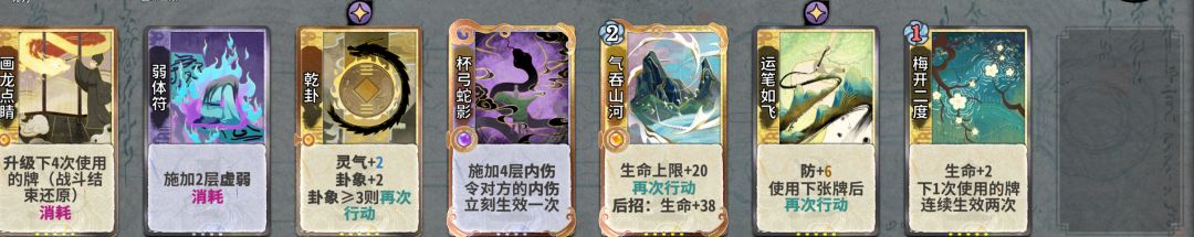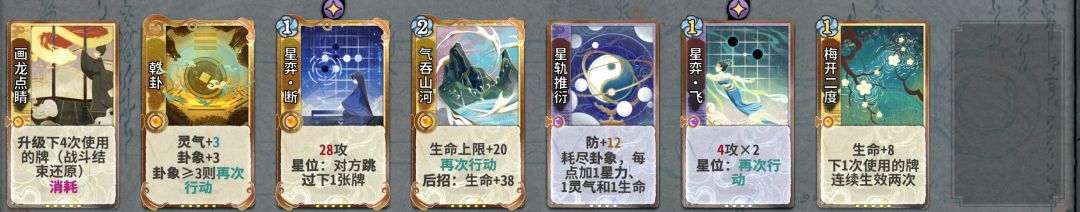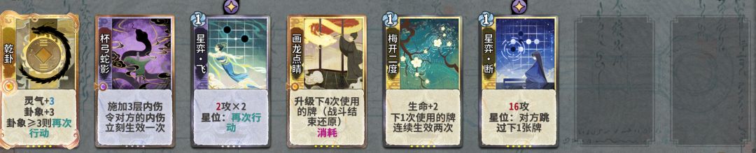 在这一套卡组中,七号位摆什么根本不重要,因为在对局中会和八号位一起被断掉。摆出这一套的思路是这样的:乾卦杯弓起手提供伤害,三号位飞防断,后手四动梅开断断对方的定魂和乾卦,这个时候对面只剩下一点蓝,可以打出梅开断,但是气吞会卡两动,这个时候我们乾卦杯弓飞梅开断斩杀。