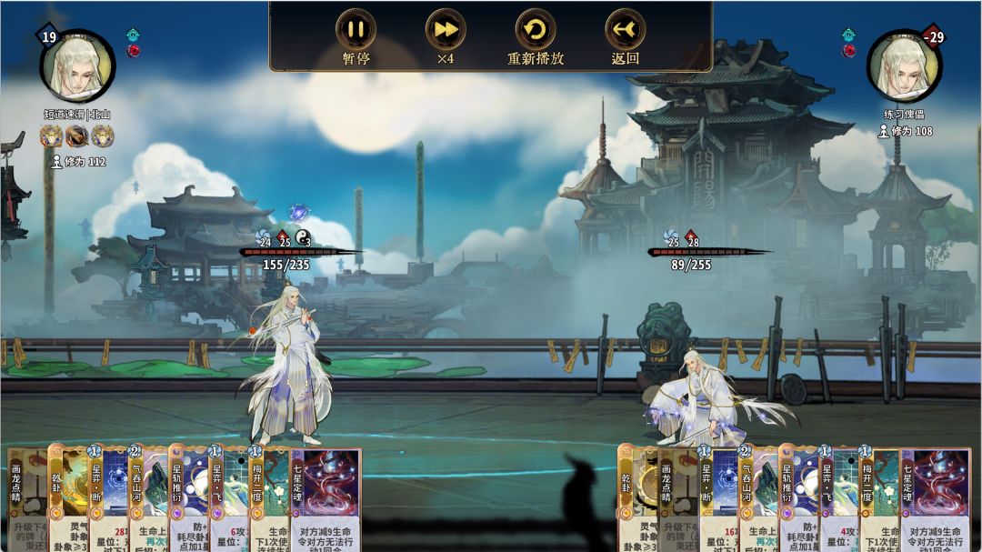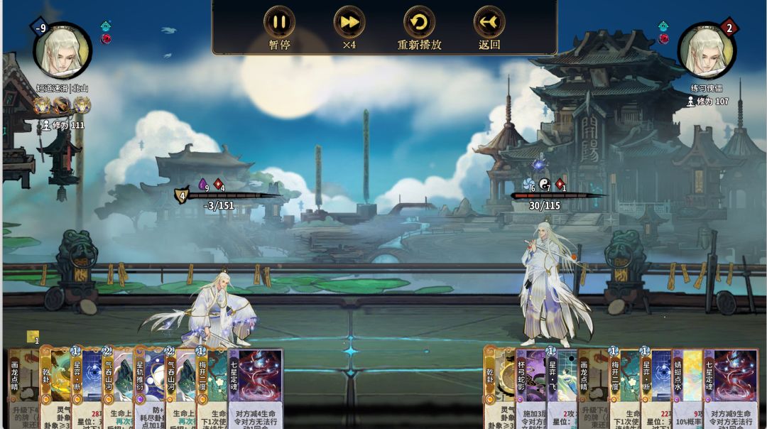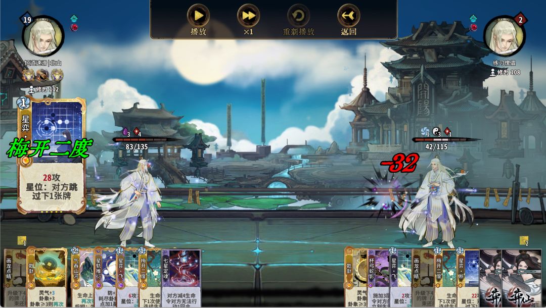 基于以上两点,当先手的一方摆出摆位二的时候,后手的一方就可以通过摆位一来取胜(当然你得满级乾卦乾卦画龙起手)。因为梅开比消耗快一动,而双方的又只有一个断和定魂在打伤害,上梅开的后手方就可以赢,除非质量差距特别大。