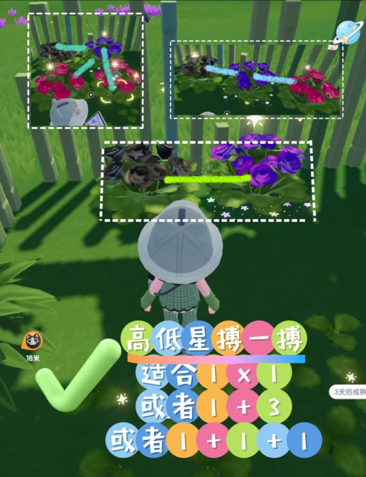 把1星花扎堆放一起,1x1到6x10,都可以~随意点~种多点自己的目标花就可