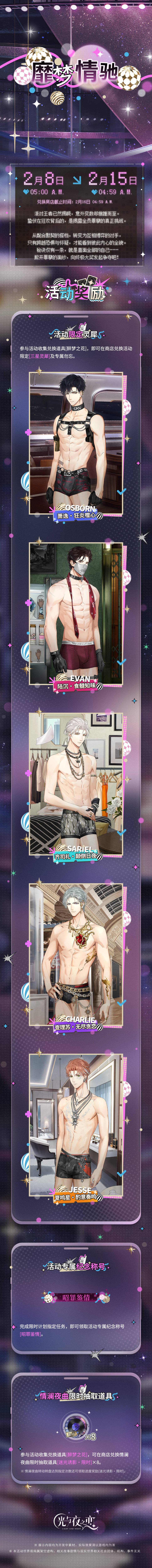 参与活动收集兑换道具[醉梦之花],即可在商店兑换活动限定[三星灵犀]及专属勿忘——萧逸・狂炎噬心、陆沉・食髓知味、齐司礼・颠倒日夜、查理苏・无尽贪恋、夏鸣星・酌意奏鸣。