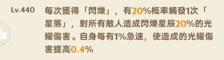 右线的机制主要围绕核心的440词条,给我的第一感觉是,不稳,但有上限。每次闪烁20%概率触发星落,有耀斑强化也才30%概率,虽说闪烁频率高,但星落触发概率较低。最终天赋又是熟悉的结算伤害,但这个结算伤害应该是不能像5转右线左脚踩右脚了,因为描述定死了,是每次蓄力期间结算一次,而蓄力时间又无法重叠。