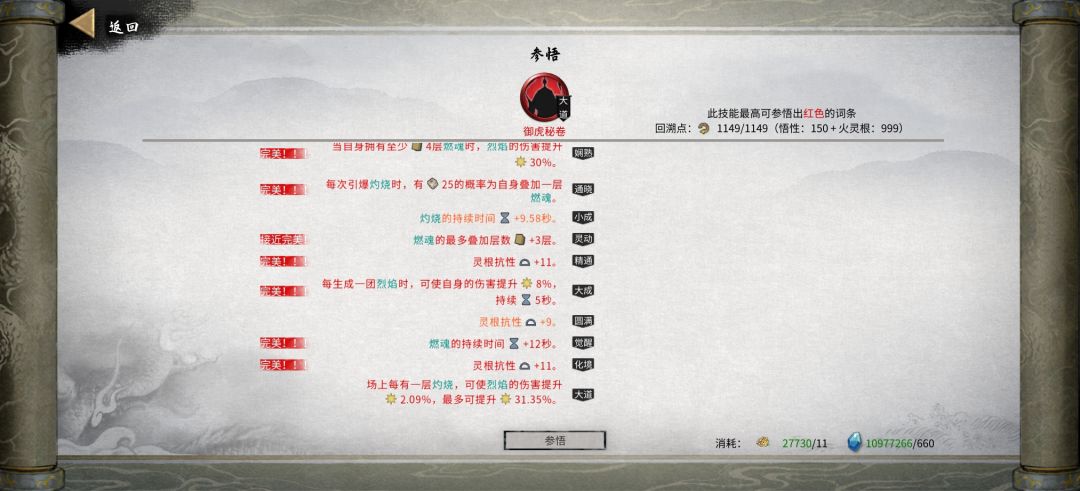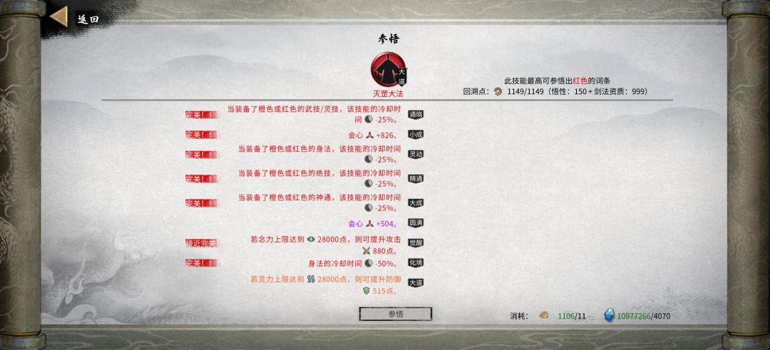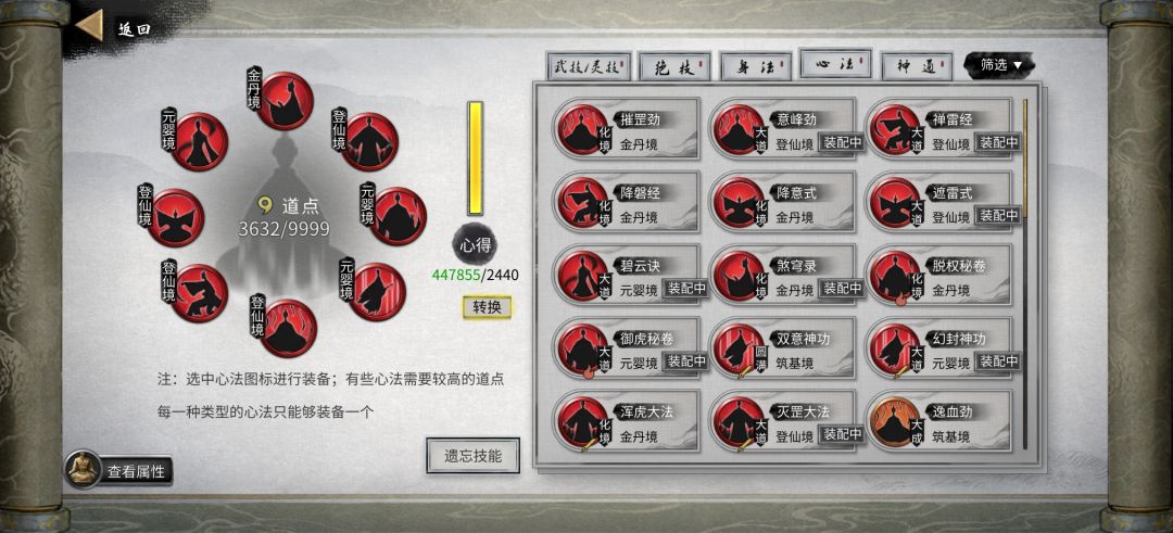 1到元婴一定要把所有功法搞到最好,刷的比较累,核心词条都是完美的,尤其是火密卷、剑大法、剑神功,截图是登仙境界的,但都是用界原石把元婴的核心词条复制过来的。醍醐宝典没用过,反正元婴成型了,密卷、大法、神功就一直没换,到登仙才换的。