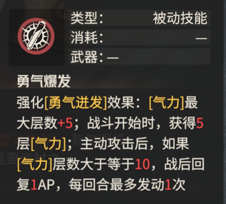 迪恩专属技能,强化天赋勇气迸发为勇气爆发,气力是迪恩的专属增益效果,同时也是其天赋的核心内容,专武对迪恩的加强主要是围绕气力进行的。