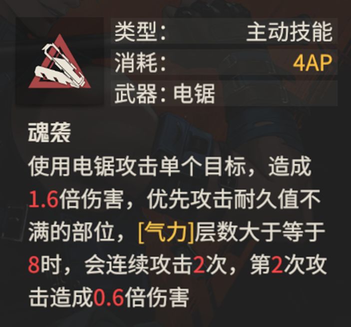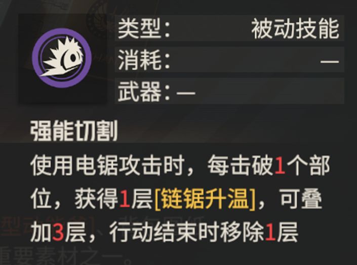 通用技能,使用电锯攻击时,每击破一个部位,获得1层链锯升温,每层提高1连击数,最多3层,行动结束时移除1层。电锯是多段攻击,连击数的增加可以显著地提高伤害,并且不会受到增伤稀释的影响,气力本身就带来了大量的增伤,如果继续提高增伤,那么效果是不好的,所以此技能是稳定的提升。并且对于迪恩来说,天赋中每1连击都会削减护甲,新加的连击数基本上是处于“无视护甲”的状态,可以造成更高伤害