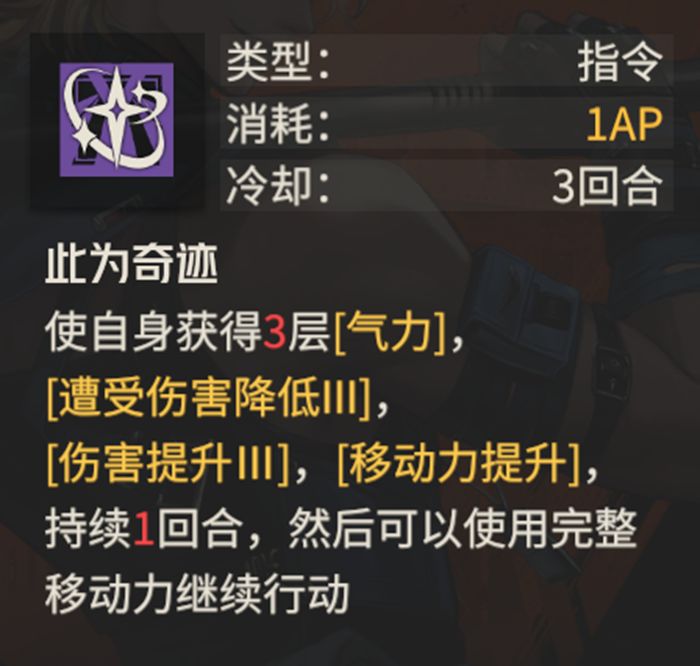 最后,主动攻击后,如果气力大于10层,战后回复1ap,迪恩再动和使用技能的ap消耗是比较大的,提高ap回复可以让迪恩有更多的攻击机会。