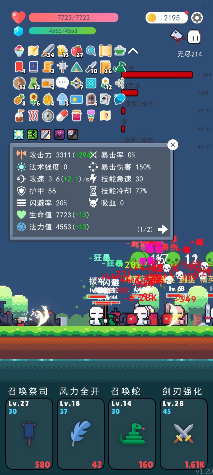 技能:60层献祭Lv9诅咒术;蛇蛇🐍(最多召唤物)、祭司(最高攻击力攻速buff)、剑刃强化、风力全开(有血钻💎可换巨大化👊🏻)。