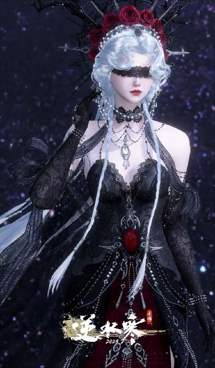 头顶猩红花冠外,黑曜头饰如黑暗向四周蔓延,这绝非鹿角,更像某种暗黑血统的证明。黑暗蕾丝目纱遮住了她的眼睛,或许,这是在保护凡人避免陷入黑暗女王双眸中的深渊?而腰间饰品上巨大的红宝石,闪动着疯狂的召唤:来夜之女王身边吧,成为她永乐的奴仆。