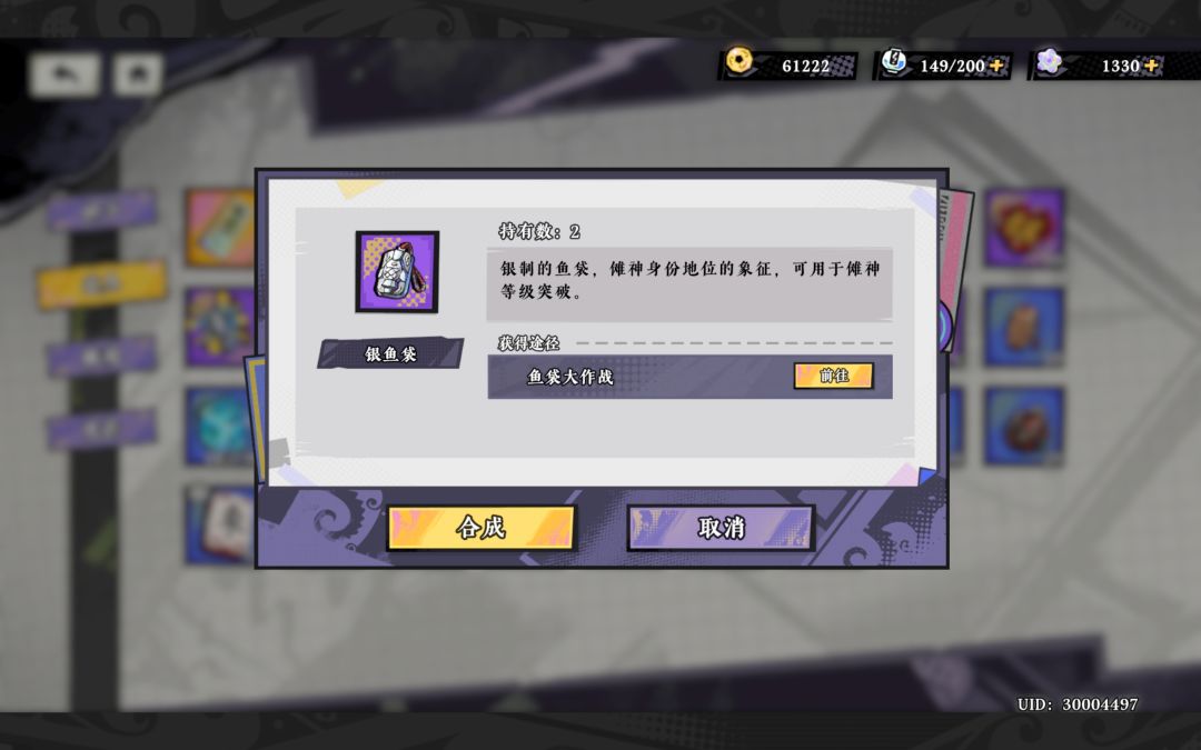 银鱼袋,金鱼袋都可以合成,去背包-道具里合成,背包里还有材料箱子和你买的咒语匣子,记得开。
