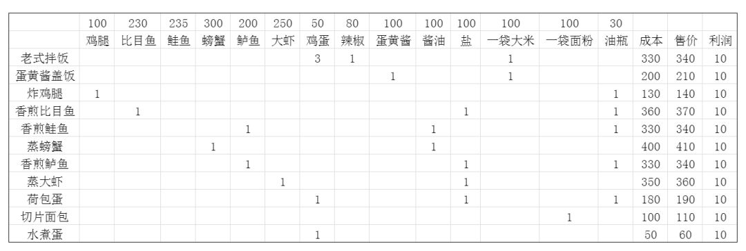 四种种植产物,每种标注不同的颜色。和种植产物标注同色的菜品,即为该产物有关菜谱中利润最高的菜品。(第一行为每种原料的成本价,其中种植产物按成熟作物直接售出的价格统计)