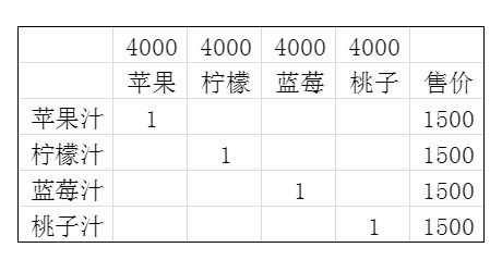 烹饪1:1产出果汁,售价均1500。