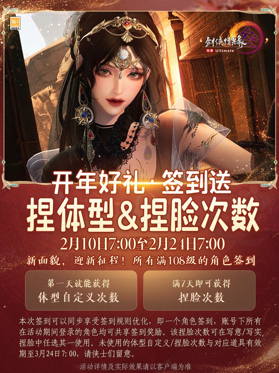 新年伊始,万象更新,开年好礼特别放送!活动期间所有满108级的角色,签到第1天直接可得体型自定义次数,而满7天还能获得免费捏脸次数好礼!只需一个角色完成签到,账号下所有在活动期间登录过的角色都可以共享签到奖励,祝侠士大吉大利,万事胜意!