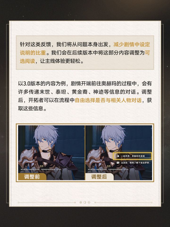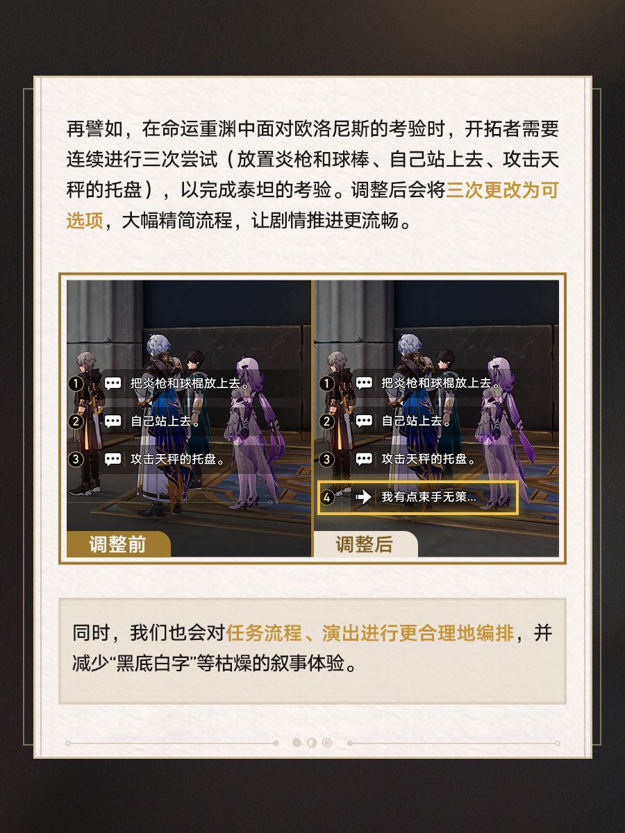 针对这类问题,官方会优化主线中的解谜设计,同时也会也会对任务流程、演出进行更合理地编排,并减少“黑底白字”等枯燥的叙事体验。