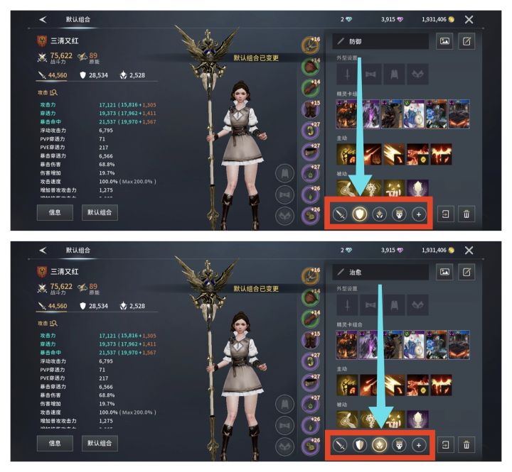 默认组合界面右下方有攻击图标,点右边✚号即预设一个职业;图标依次为:攻击,防御,治愈,野怪!当然所有的搭配还是第一个攻击图标的配置。