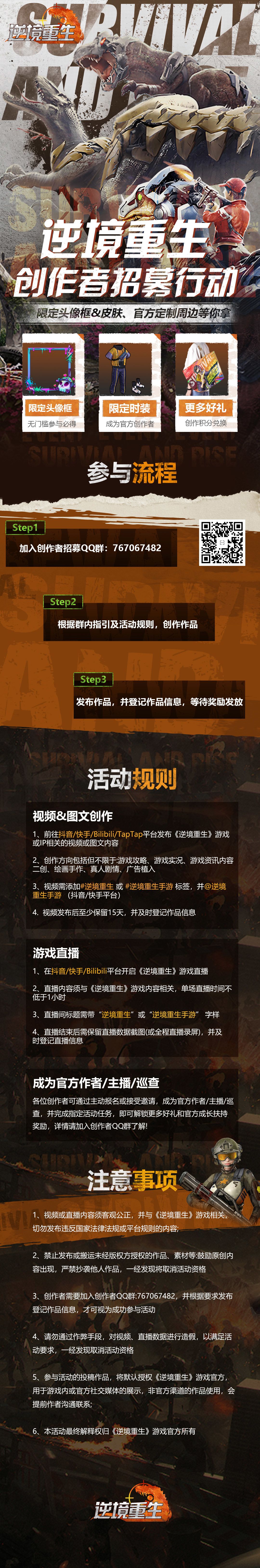 发布《逆境重生》游戏视频或直播可无门槛获得限定头像框奖励,投稿更多视频、加入官方创作者可解锁限定角色套装、专属称号、官方定制周边以及官方成长扶持等海量好礼!