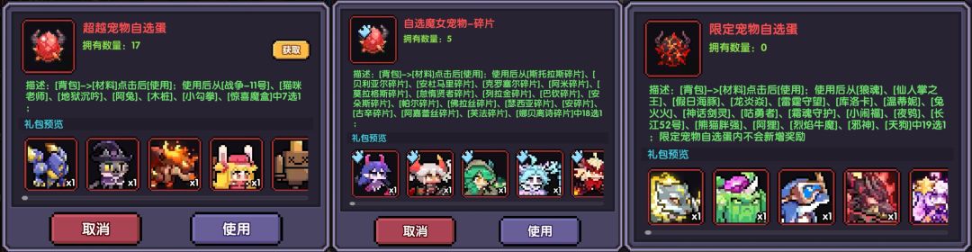 宠物从获取的难易程度上可分为三类,普通红宠、魔女宠、限定宠。