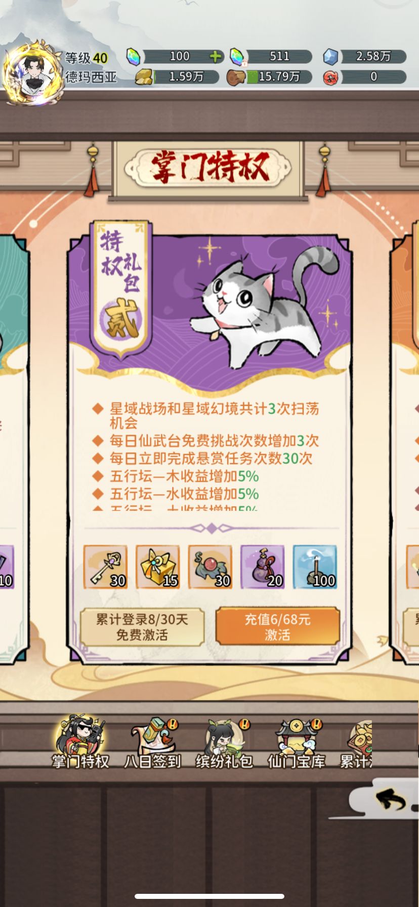 8氪金方面我觉得掌门特权最有用。不过我只是猜测,毕竟那些强力弟子我也没体验过。但是金灵根顶天10,我慢慢刷就能刷出来。我又不打擂台。