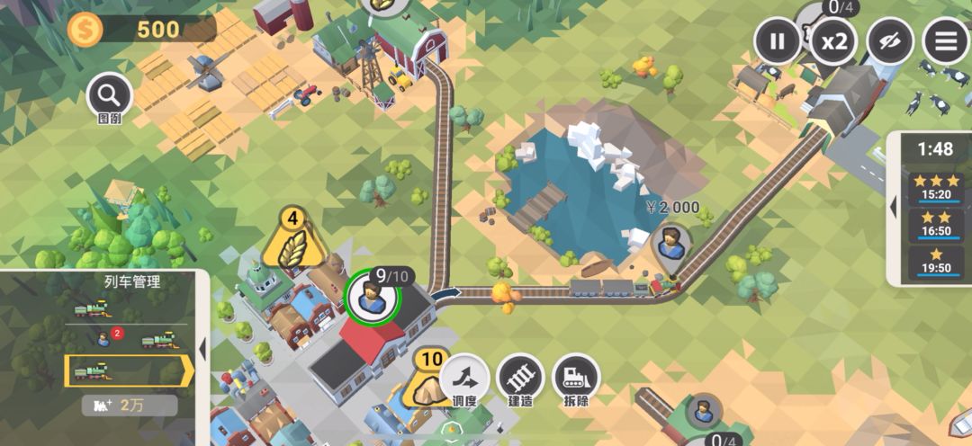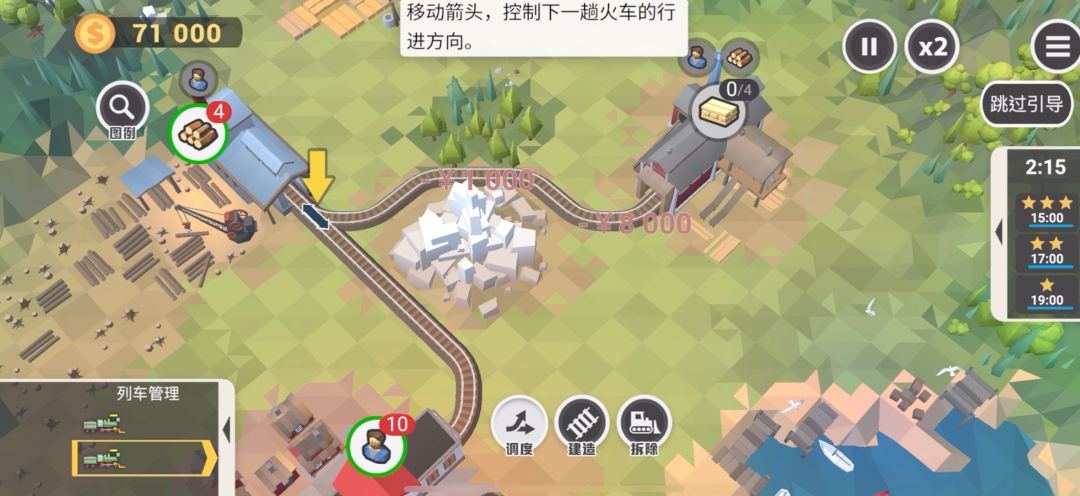 让木头运输去木材厂——建造镇子前往木材厂的轨道,同时调整箭头方向,让两边来回都直通——运输工人去木材厂,1个工人会将1个木头变成1个木材——运输木材回镇,一次最多运2个——木头和木材都满足镇子需求后完成第2关。