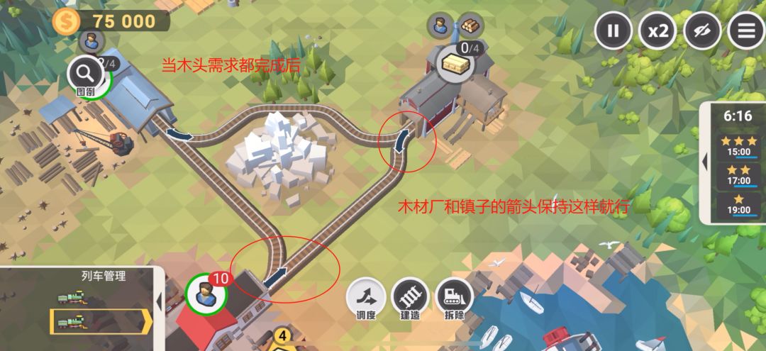 流程:拆除损坏的铁路并重新连接,修车——暂停火车头然后再次让它运行起来——查看需求清单——运输木头回城并再次派工人(这一步把镇里所需的木头全给运回来最佳,后续箭头固定好就不用再调整了)——建造木板厂并让伐木场与木材厂连接——点击箭头改变伐木场前方木材厂的轨道方向。