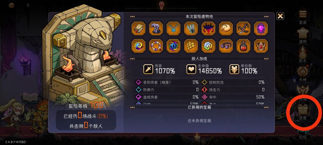 在开始的界面点一下这里,就可以看到本次冒险的遗物有哪些(高难如果没有上面两个直接可以跑了)
