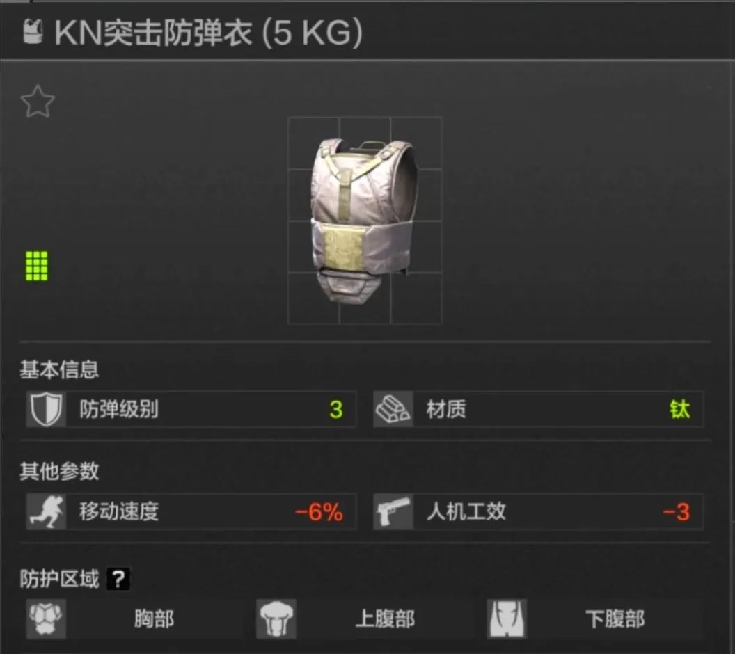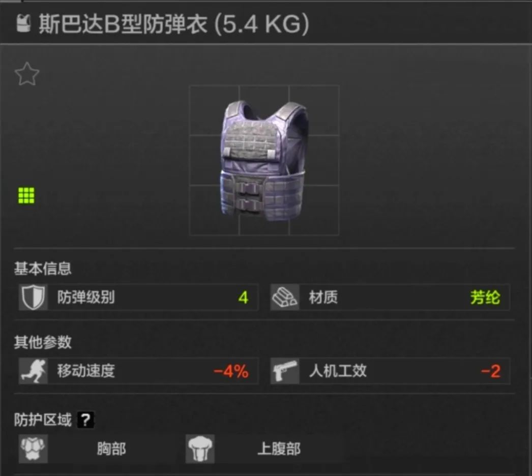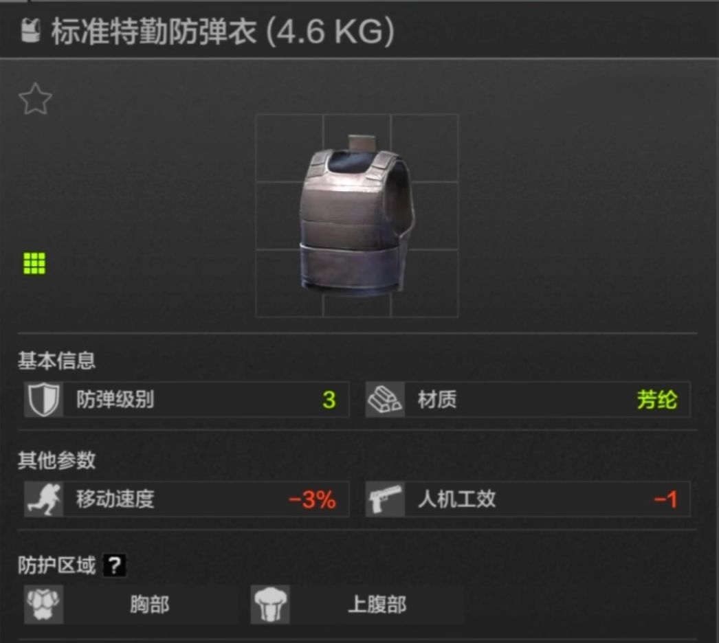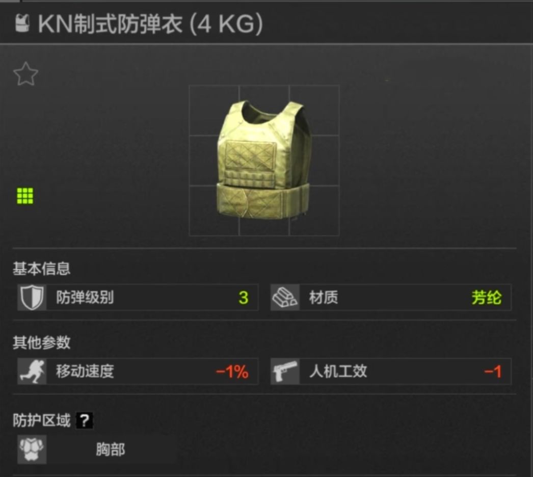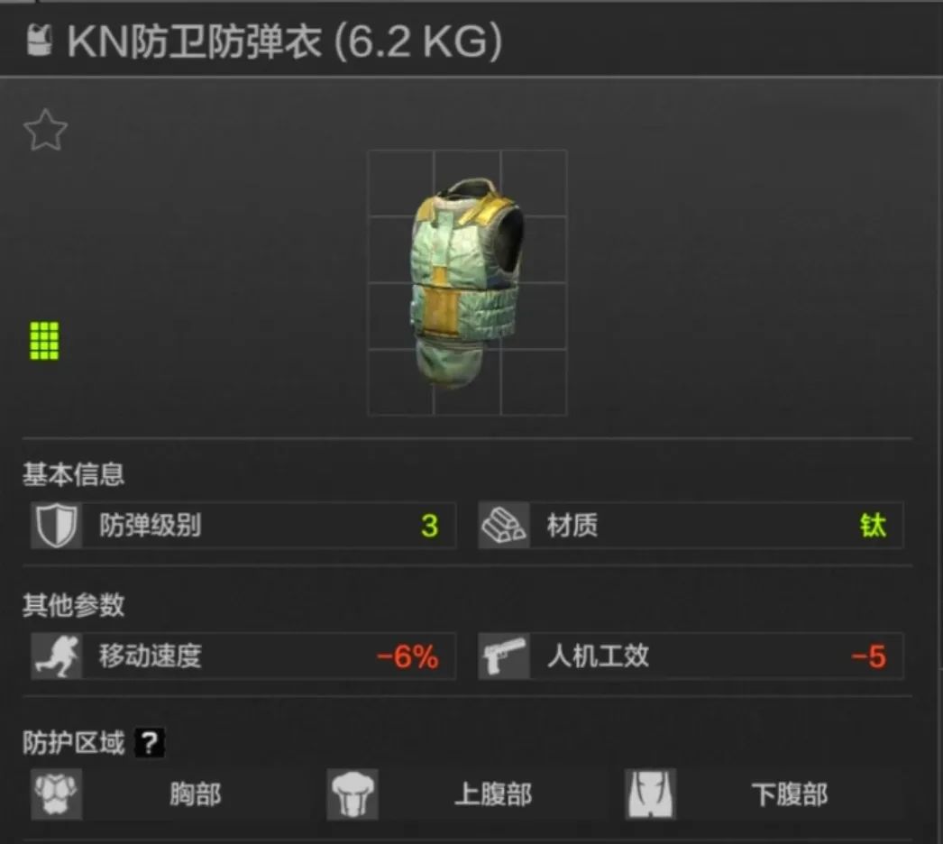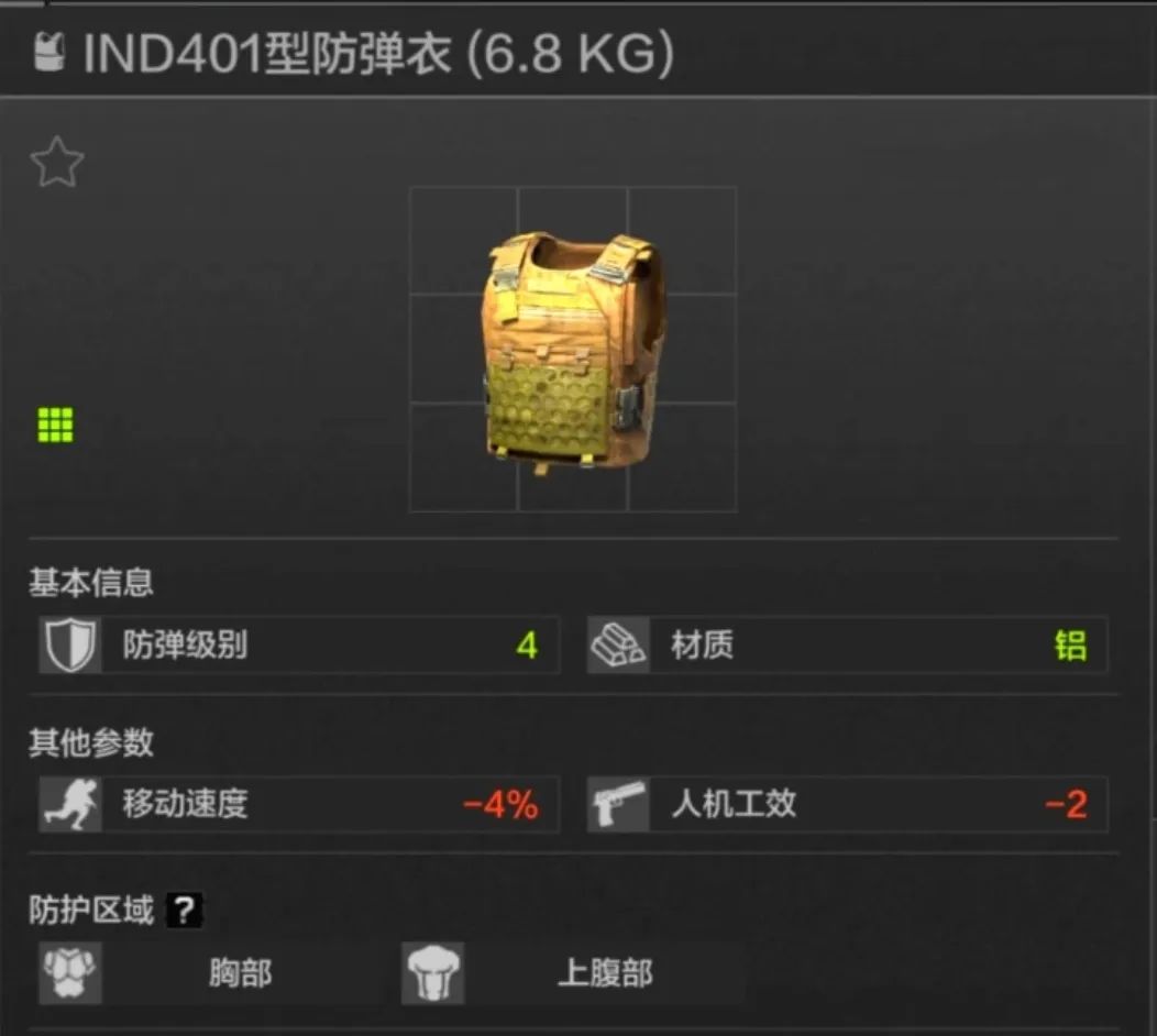 45耐久,胸部上腹部防护,应该是每一位暗区玩家用过的第一款防弹衣,但护甲材质一般,综合价格来看,个人不大推荐。