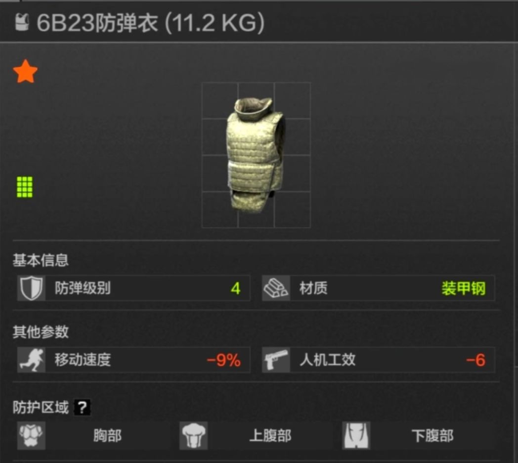 65耐久,胸部上腹部防护,护甲材料一般,有时会在对局里遇到穿6B13的人机。