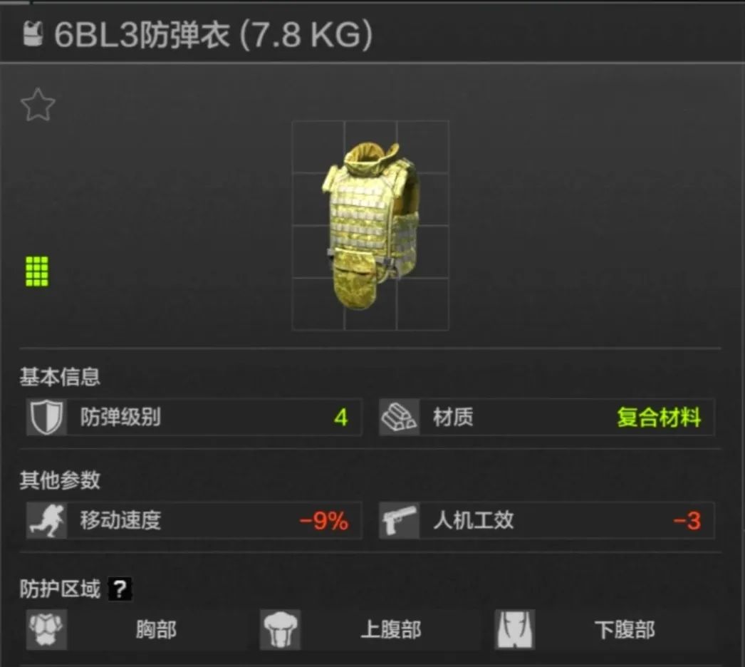 50耐久,胸部上腹部防护,是防护性能最好的三级甲,也是我最推荐的一款三甲,抗三级穿透非常够用,同时移速和人机功效的debuff可以接受,普封够用,面对A1、7N31、SS190等高级穿透子弹也有机会扛下两发。
